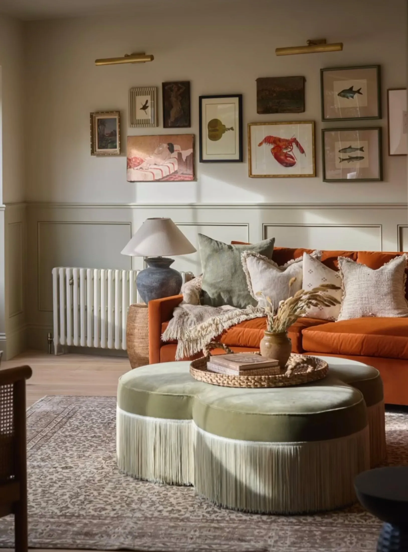 Head into the first reception room – a formal setting that exudes warmth, backdropped by soothing sage walls, an inviting fireplace and an assortment of sink-in seating. For more cosy conversation spots, there’s a snug set against stylish shiplap walls. Elsewhere, the garden room introduces a playful counterpoint, its bold artwork and statement orange sofa positioned perfectly for cinematic lounging. Here, bi-folding doors retract entirely, dissolving the boundary between the indoors and the garden beyond — ideal for streamlined flow during the summer months.